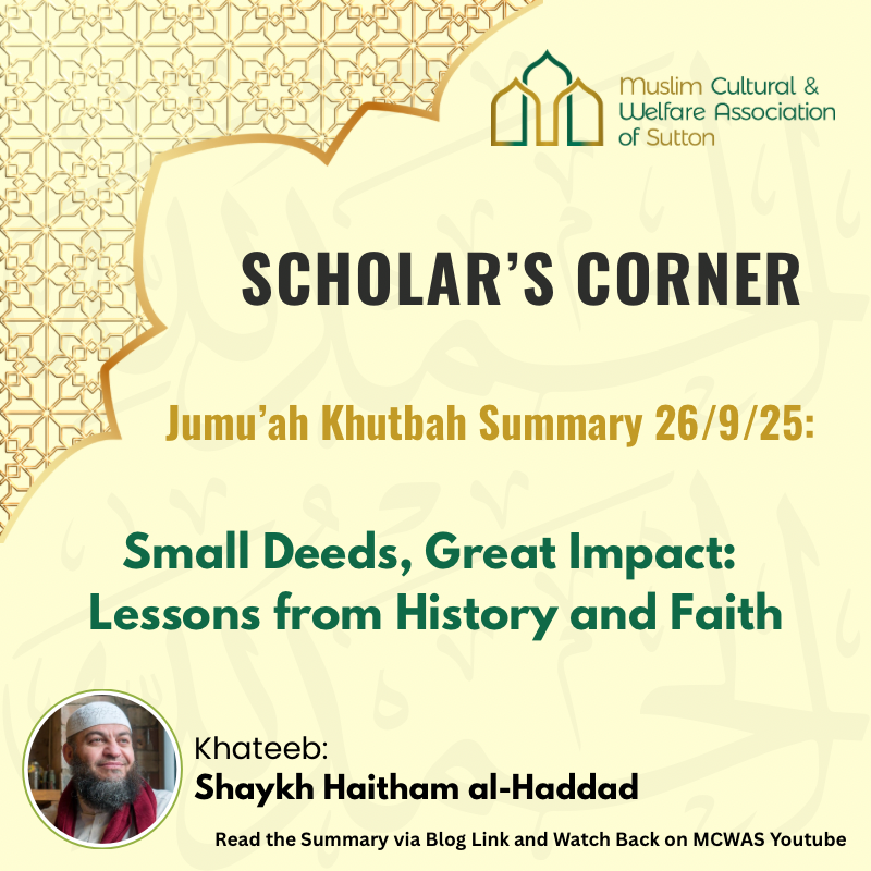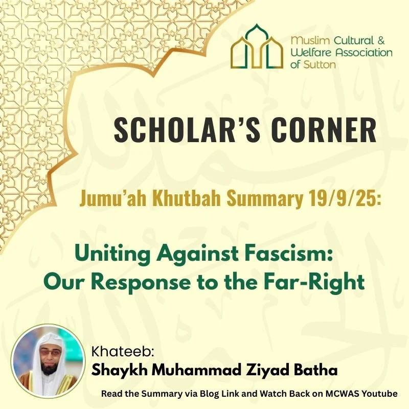 Scholar’s Corner Muhammad Ziyad Batha 03/10/2025 Muhammad Ziyad Batha 03/10/2025 Weathering the Media Storm: Community Advice (Jumu’ah Summary 03/10/25) Khutbah Summary 26/9/25 Read More Muhammad Ziyad Batha 26/09/2025 Muhammad Ziyad Batha 26/09/2025 Small Deeds, Great Impact: Lessons from History - Shaykh Dr Haitham al-Haddad (Jumu’ah Summary 26/9/25) Khutbah Summary 26/9/25 Read More Muhammad Ziyad Batha 19/09/2025 Muhammad Ziyad Batha 19/09/2025 Uniting Against Fascism: A Message to the Far-Right (Jumu’ah Summary 19/9/25) Read More Muhammad Ziyad Batha 14/09/2025 Muhammad Ziyad Batha 14/09/2025 The Tongue: A Double-Edged Sword (Jumu’ah Summary 12/9/25) Read More Mamun Khan 07/09/2025 Mamun Khan 07/09/2025 The Beauty of Muhammad ﷺ: Reflections in Rabi’ al-Awwal (Jumu’ah Summary 5/9/25) Read More
