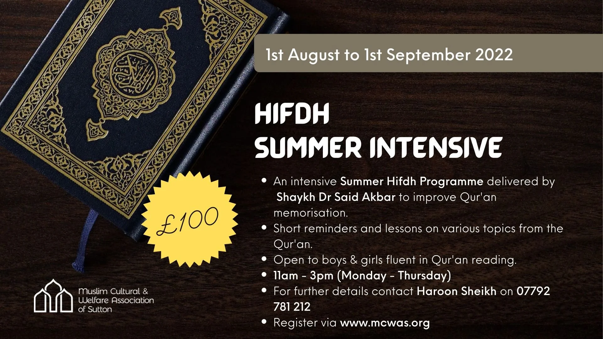 Join us at MCWAS this summer for an intensive *Summer Hifdh Programme* delivered by *Shaykh Dr Said Akbar* to increase Qur'an memorisation.